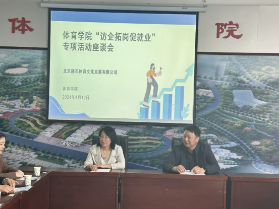 为了深入学习贯彻党的二十大精神,落实教育部全国高校书记董事长访企拓岗促就业专项行动,全面深化校企合作、供需对接,促进2024届毕业生高质量对口就业。beats365于4月12日下午三点半,在体育馆201开展了与北京赫石体育文化发展有限公司的“放弃拓岗促就业”专题座谈会,座谈会由beats365副经理高峰主持。