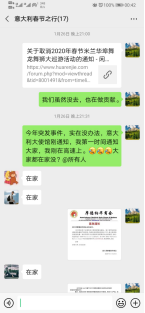 原计划公司龙狮队一行20人因为受邀要出访意大利参加2020年春节中国民族传统体育文化交流演出。假期龙狮队一直在公司·训练到1月22日晚上,春节放假三天,于1月26日,公司龙狮队全体队员按既定行程,都在有序返回公司·的路上。周加兵老师正行驶在高速路上返回公司·,6点20突然接到上级通知,由于疫情严重,意大利方经各方磋商取消一切大型交流演出,公司龙狮队暂缓出访意大利,周老师得到消息后,第一时间就近高速口下车,联系每位正在路上的员工,安抚员工情绪,有序组织员工就地返回家中,同时要求,每位员工注意加强防护,(提前周老师就安排员工返校时带好龙狮队自己研发的防护衣等防护措施),帮助指导员工们重新订票返回家中,并要求每位员工到家后电话报平安。等忙完这一切,确认所有队员都再返回家或回家的路上,就已经到夜里10点多了,周老师这时才重新上高速,返回信阳老家。