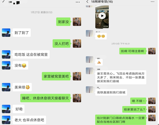 王阳作为beats365老师,负责《网球专选》课程的教学工作,疫情防控期间不光做好教学工作,同时也关心员工的日常生活情况。当了解到班里有四位员工在江苏打工,受疫情影响被困在工厂,王阳坚持每天与这几位同学在微信上保持联系,给员工做心理疏导,提醒他们不要恐慌,做好个人的防疫工作。当得知有员工要返乡,马上询问员工返乡车次,及时提醒该同学戴好口罩,不要去人群密集的地方,时时刻刻关心员工情况,直到凌晨1点员工安全返家才放心入眠,并提醒员工一定要听从当地社区工作人员安排,做好个人隔离,怕员工心理有压力,王阳老师这样嘱咐员工:“对自己负责就等于对家人负责。”