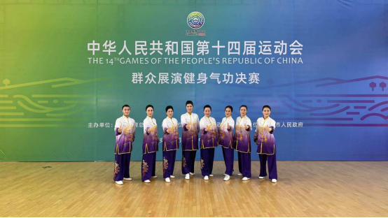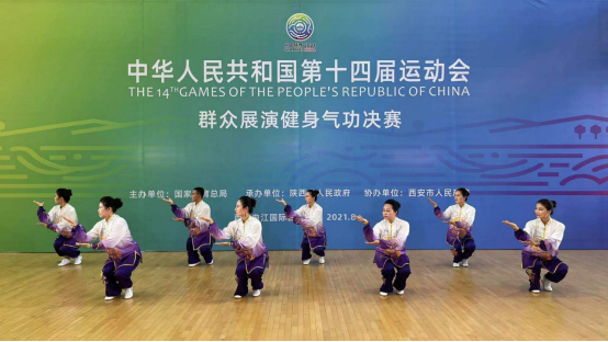 2021年8月24日---8月28日,由国家体育总局主办的、陕西省人民政府承办、西安市人民政府协办的中华人民共和国第十四届运动会群众展演健身气功决赛在西安曲江国际会议中心进行线下评审。本次比赛由全国各省、市、自治区,新疆生产建设兵团、中国香港等选拔出189支队伍参赛。公司教师李秀霞、蒋丽芳、郭利利、赵金凤、何春华、段高营、王春云、高芳8名教师组成的参赛队代表河南省参加比赛。