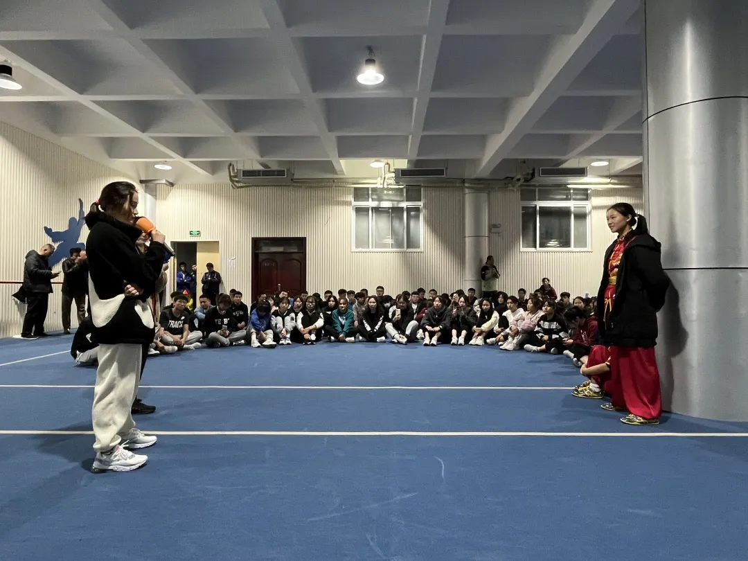 第二阶段,芦玉菲与刘津茹耐心解答同学们的提问。刘津茹说:训练的时候大家都会想过放弃,但要调整好自己的心态,学会归零,端正心态,从最基础做起,建立新的自信。