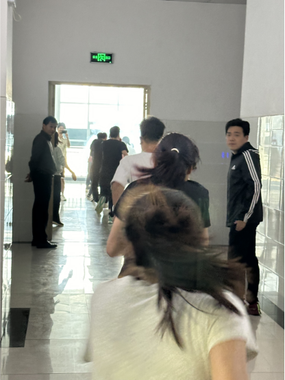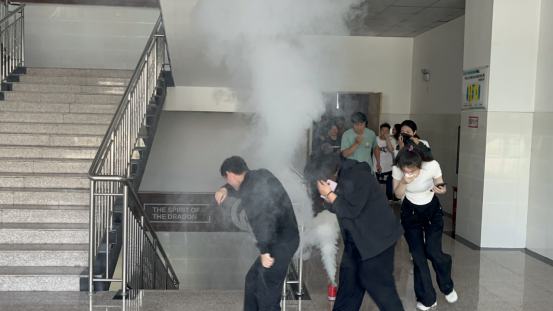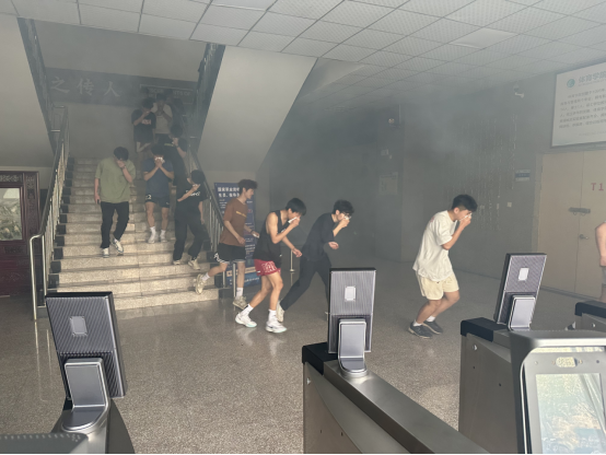 下午4点10分,随着烟雾在体育馆三楼的升起,消防演练正式开始。各场馆员工按照演练要求,迅速做好自我保护,然后手捂口鼻、低头弯腰,快速地撤离体育馆。楼层指挥的老师护送员工依次下楼,全体师生都在较短时间内快速、高效地完成了撤离,安全有序跑到体育馆门前广场集合,完成了疏散演练。